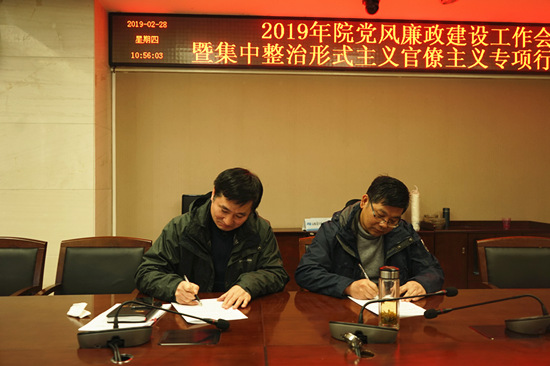 会上,张峰书记代表院党委与院领导班子成员和各部门负责人分别签订了党风廉政建设责任书,并带领全体参会人员进行了廉政宣誓。
