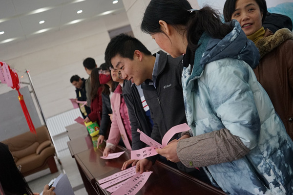 一楼大厅里,数百条元宵谜题展现在大家眼前,谜语内容涵盖时政、历史、文化、廉政、生活等各个方面,有通俗易懂的形象猜题,又有千奇百怪的抽象字谜,大家一会冥思苦想,一会共同讨论,一边比划一边猜,现场气氛热烈。