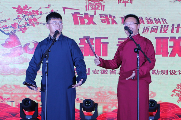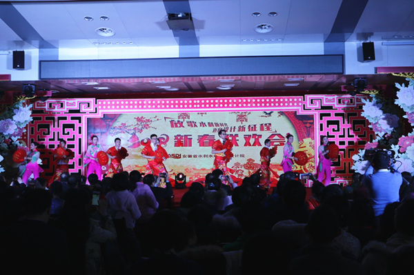 联欢会在红红火火的开场舞《美丽中国》中拉开了序曲,舞蹈中饱含着年轻人满满的自信和对未来的殷殷期盼;随后离退休干部神采奕奕上台献唱《万泉河水清又清》《欢乐中国年》,台下观众对老一辈水利人致以诚挚敬意。此外,小品《跨越世纪的梦想》、舞蹈《鸡犬和鸣》、双簧《贺新春》、歌曲《那些花儿》、诗朗诵《梦想起航》、太极表演等……一个个由职工们精心准备自编自演的节目轮番上演。演出最后,一曲《歌唱祖国》引起在场观众的强烈共鸣,院领导带领全体员工大合唱,放歌水利新时代,迈向设计新征程,为本场联欢会画上圆满的句号。