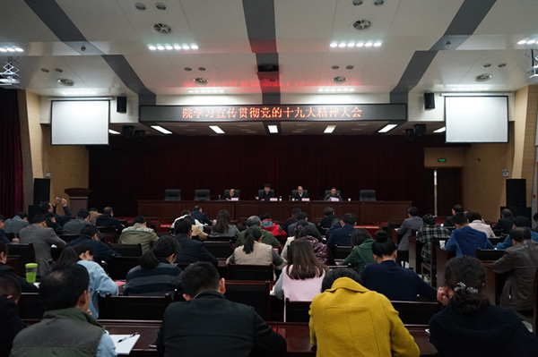 张峰书记在讲话中指出,党的十九大精神具有引领复兴、兴党强国等重大意义。一要深刻领会党的十九大报告的精神实质;二要真正学懂党的十九大精神核心要义,坚持用习近平新时代中国特色社会主义思想武装头脑;三要以十九大精神为指导,科学分析我院发展不平衡不充分的问题;四要以学习宣传贯彻党的十九大精神为动力,全力推进各项工作砥砺前行;五要切实加强组织领导,在全院迅速掀起学习十九大精神热潮。