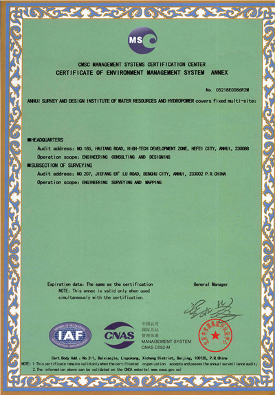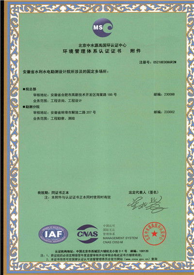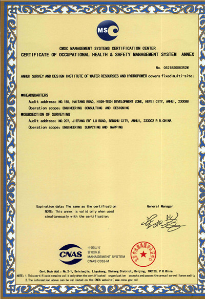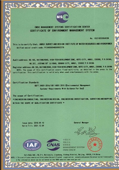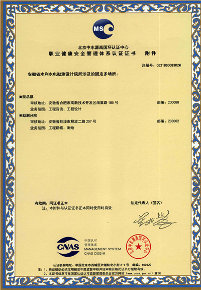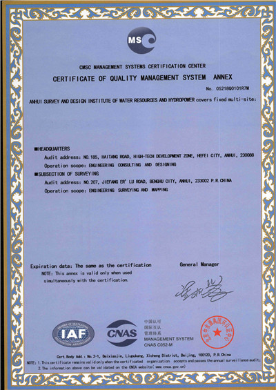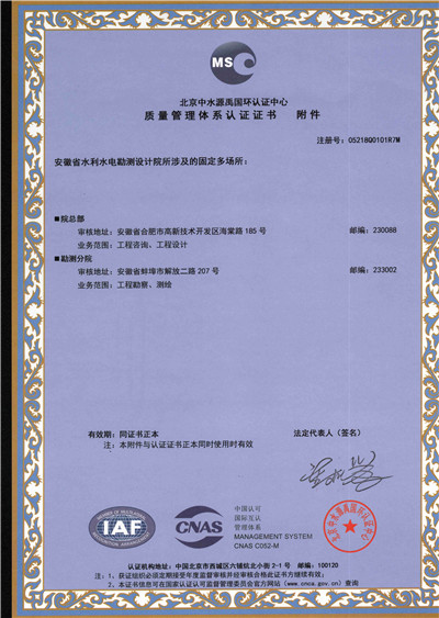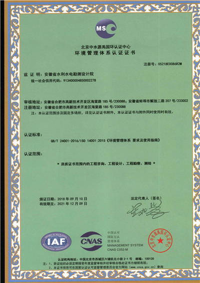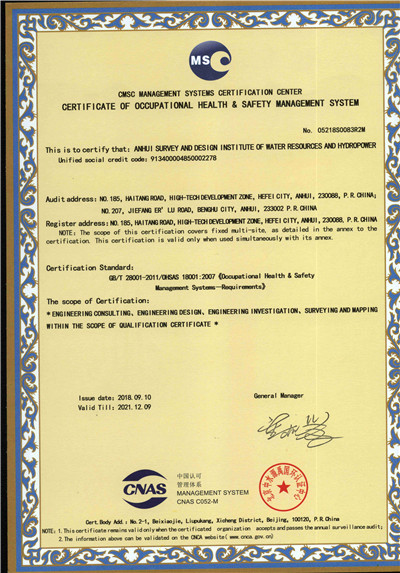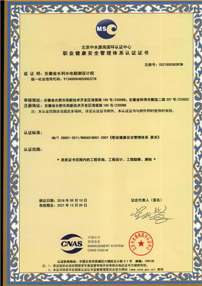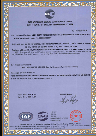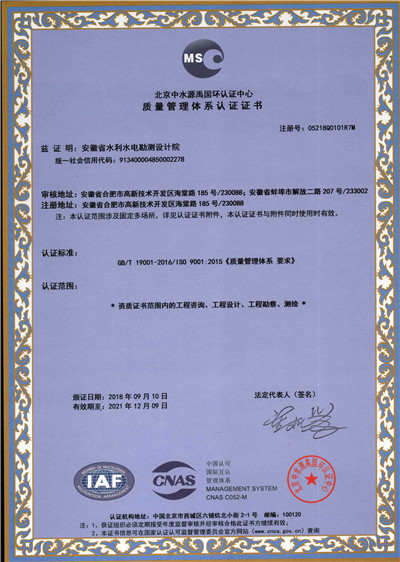 安徽省水利水电勘测设计院(简称ASDI)于1996年开始贯彻ISO9000族标准,进行质量认证工作,1997年12月首次通过ISO9001质量体系认证,期间经历了ISO9001:1994、ISO9001:2000、ISO9001:2008标准认证,建立了符合ISO9001标准的质量管理体系。2012年通过GB/T19001-2008、GB/T24001-2004、GB/T28001-2011的“质量/环境/职业健康安全”三标一体化认证,2018年通过GB/T19001-2016、GB/T24001-2016和GB/T28001-2011“质量/环境/职业健康安全”三标一体化换版认证。